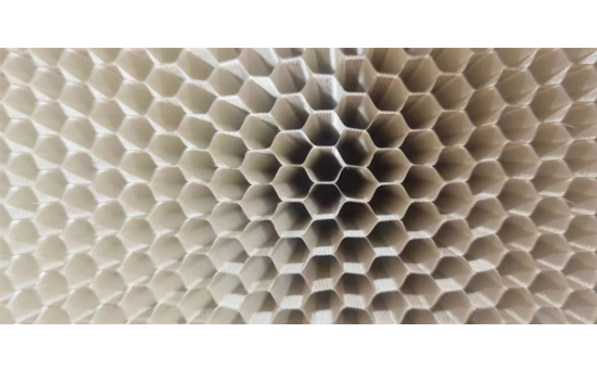 玻璃布蜂窝由玻璃纤维布与蜂窝芯材复合而成,具有轻质高强(比强度优于传统材料)、隔热隔音(孔隙率>95%)、耐腐蚀(抗水、油、气体侵蚀)及易加工(可切割、冲压、钻孔)等特性。其六边形蜂窝结构通过仿生设计将剪切力分解为轴向压力,单孔壁厚误差≤±0.005mm,节点强度≥2.0N/mm。